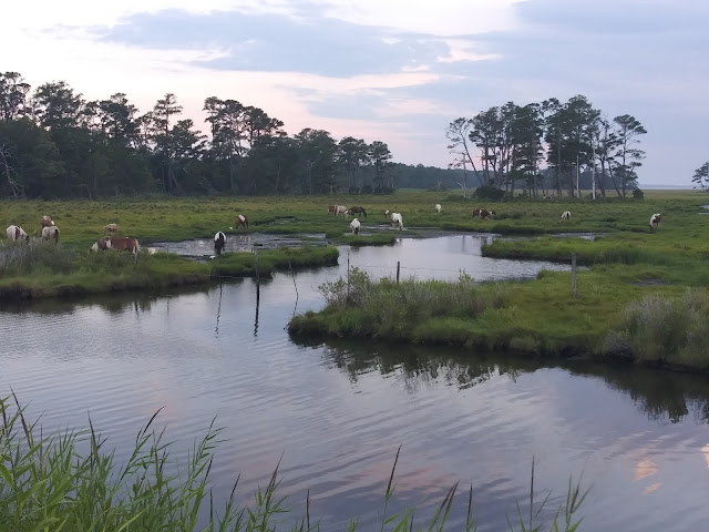 Closer to Assateague Island beaches the freshwater pools changed to black. This was because of the pine needles that fell into the water and made the waters more acidic. It is not something we noticed at first, because the change is sudden as you pass a grassy patch that hides a dam. But it is remarkable once you look closer. I'm sure not everyone notices as they drive by in their cars and mopeds. But I am very appreciative of Laurel, the Park Ranger, whom I interviewed earlier, and explained the methods they used to control water flow on the conservation lands. Just as sudden as the waters turned black, they were back to being milk chocolate on the other side of the dam.